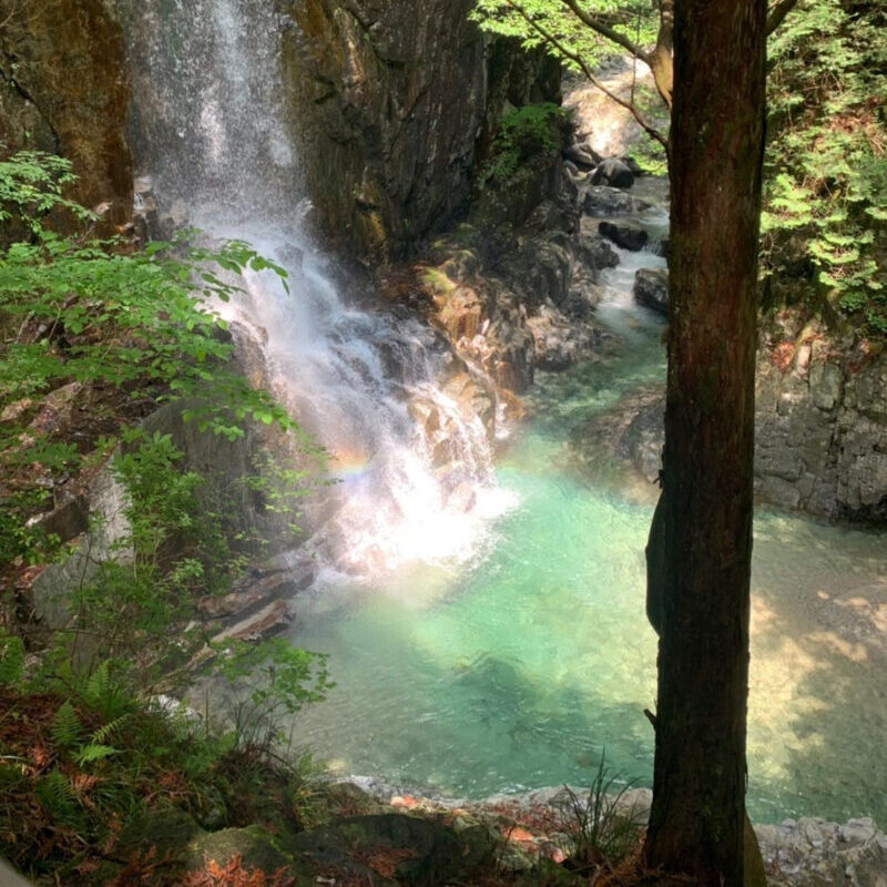 滝壺は透き通るような青色で、どうしてこのような色になるのか不思議です。